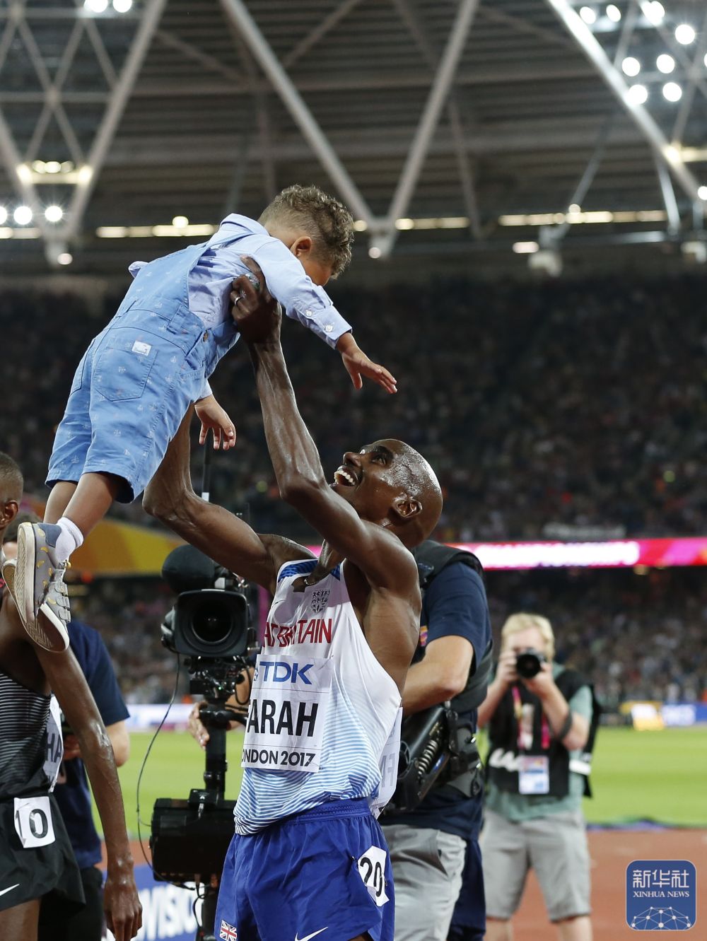 ↑2017年8月4日,2017年国际田联世界田径锦标赛男子10000米冠军、英国选手法拉赫在夺冠后和孩子庆祝。新华社记者 韩岩 摄