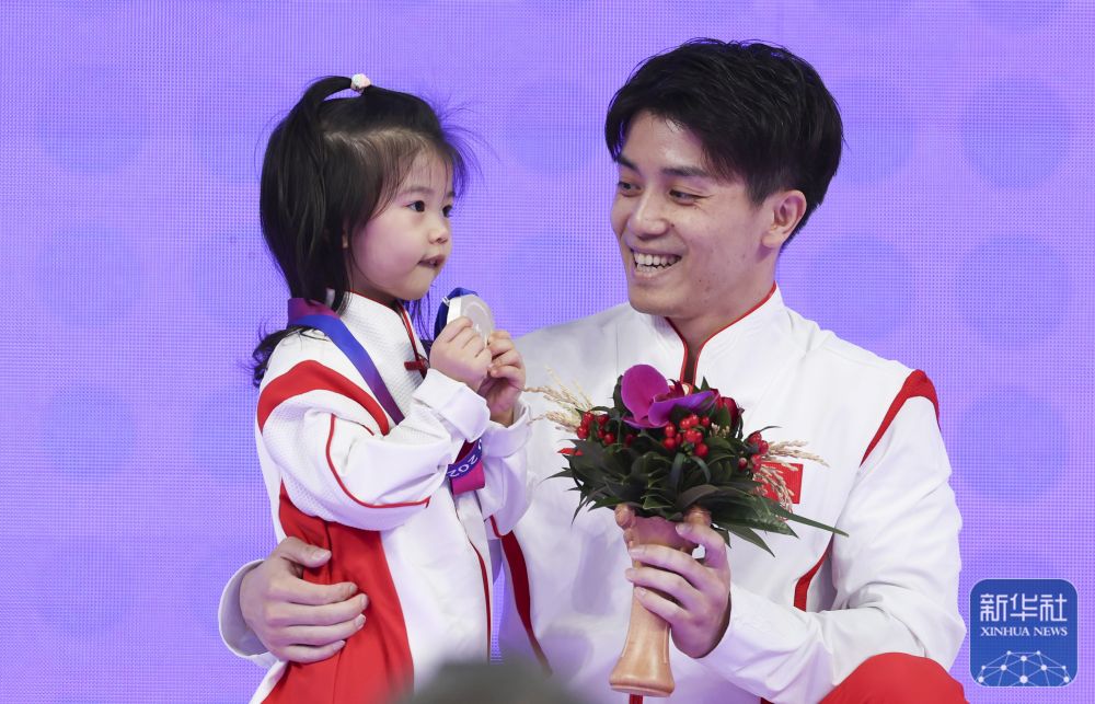 ↑2023年9月29日,杭州亚运会竞技体操男子单杠亚军中国选手林超攀(右)在颁奖仪式后与女儿合影。新华社记者 程婷婷