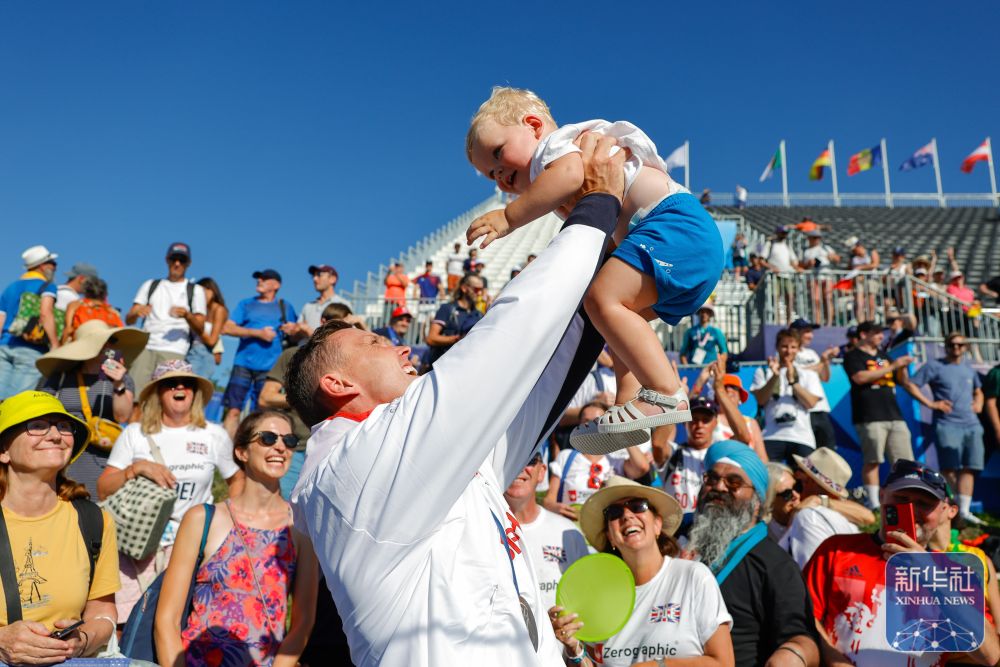 ↑2024年8月5日,巴黎奥运会皮划艇激流回旋男子极限皮艇亚军英国选手克拉克(前左)在比赛后和孩子互动新华社记者 沈伯韩