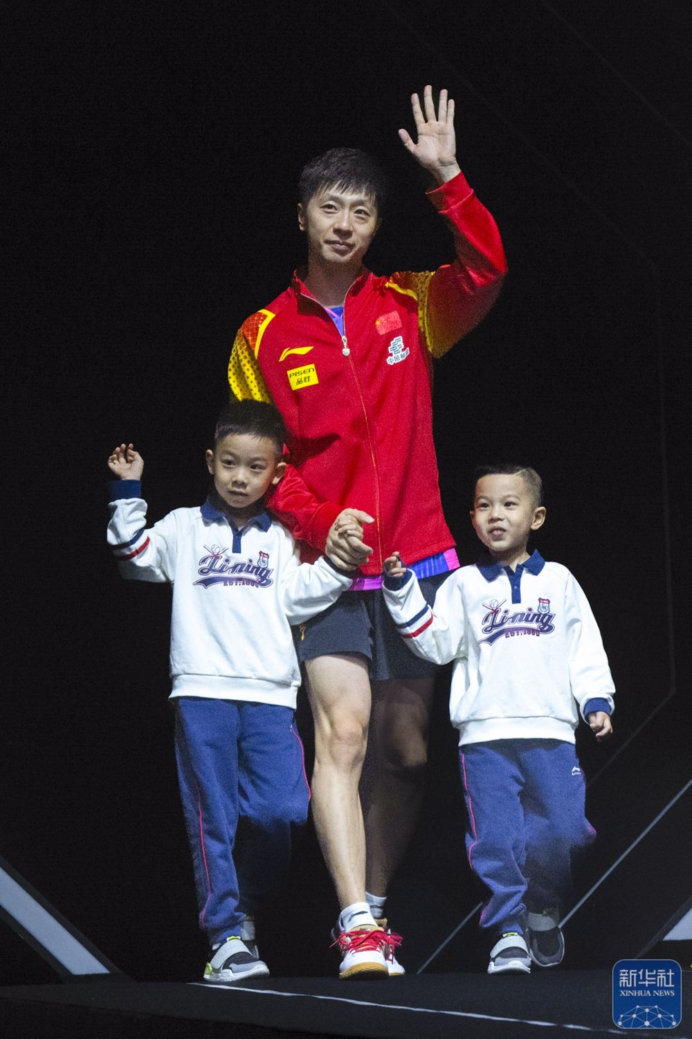 ↑2024年9月30日,2024年世界乒乓球职业大联盟(WTT)中国大满贯男单首轮比赛前,马龙带着他的儿子们步入赛场。新华社记者 肖艺九 摄