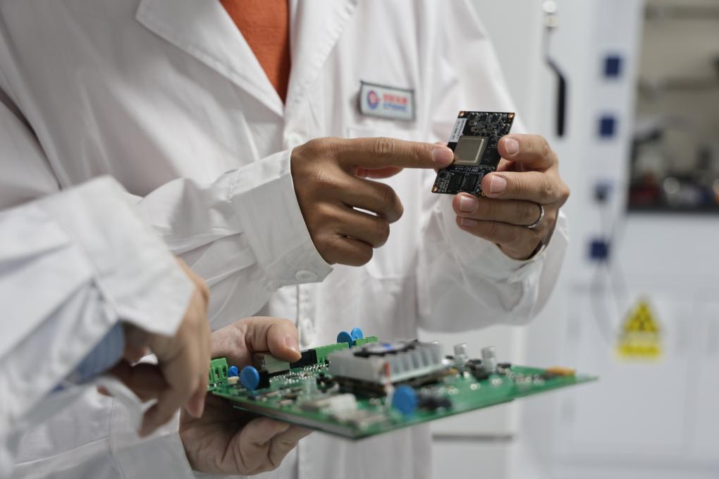 中国海油工程人员展示基于飞腾CPU开发的设备主板。(中国电子飞腾公司供图)