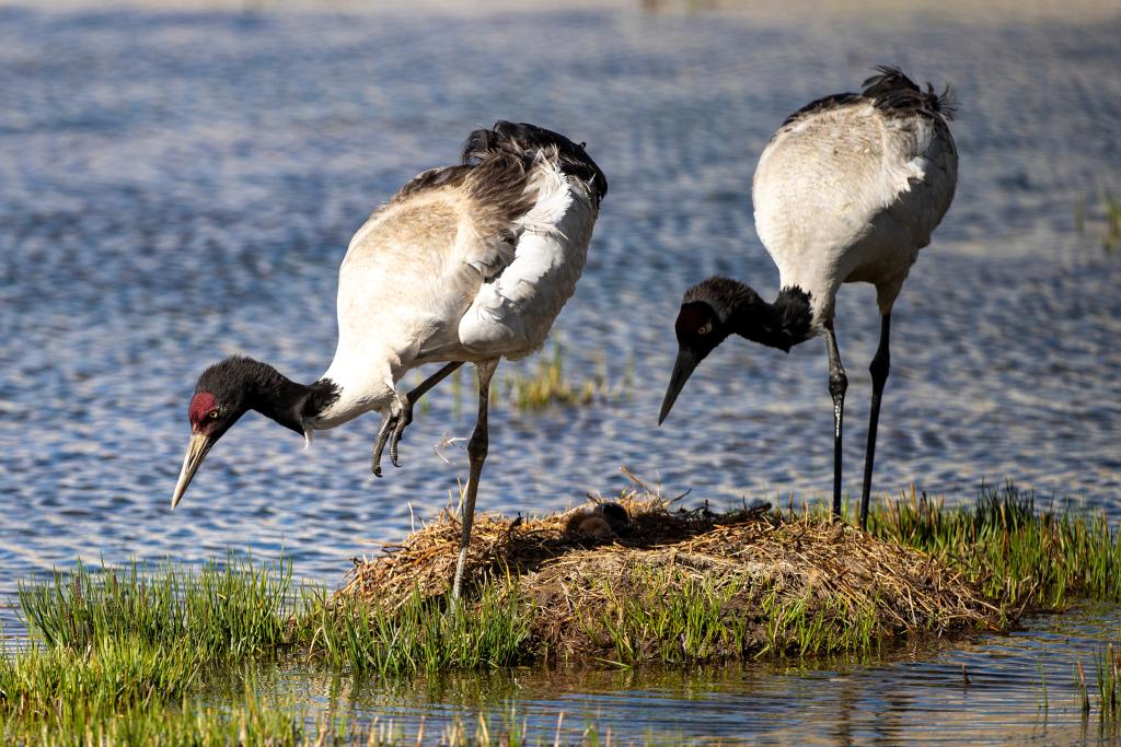 黑颈鹤在那曲市申扎县申扎藏布湿地孵蛋(2024年6月7日摄)。新华社记者 姜帆 摄