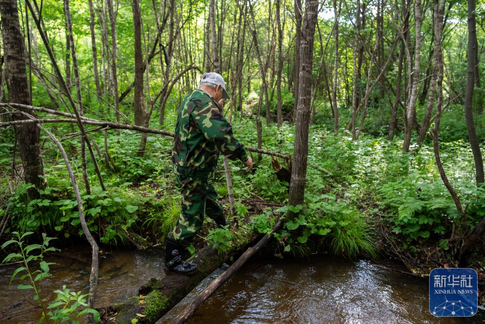 ↑ 6月17日,在七星山国家森林公园,集贤县革命老区建设促进会的工作人员在林间寻找东北抗联遗址。