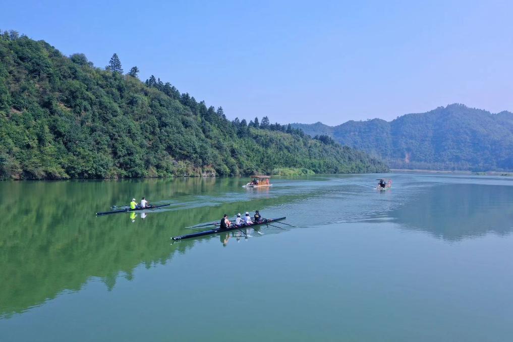 游客在平垣秘境景区内,体验赛艇、木筏漂流等项目。新华社发