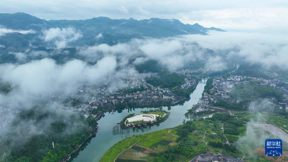 6月19日在重庆市秀山土家族苗族自治县拍摄的雨后洪安古镇(无人机照片)。新华社发(胡程摄)