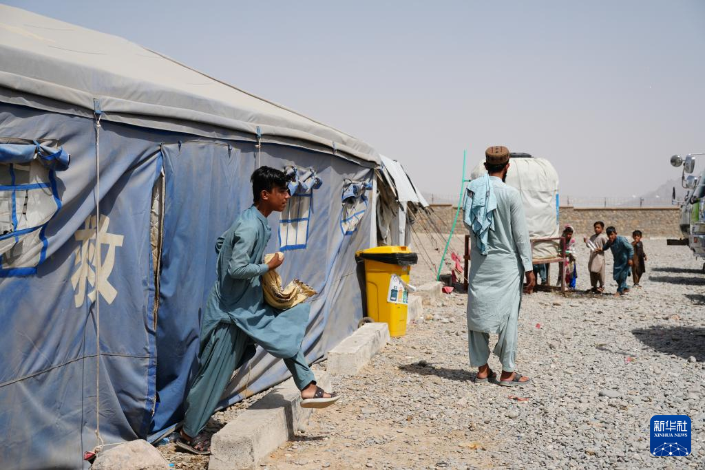 6月15日,在阿富汗坎大哈省塔赫塔普勒地区的安泽吉难民营,一名少年从中国援助的帐篷里走出。新华社记者 李昂 摄