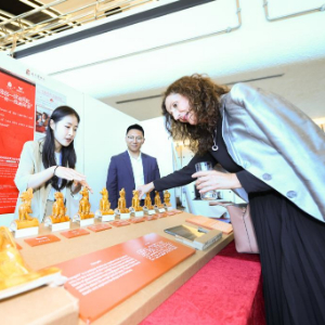 6月16日,在瑞士日内瓦万国宫,嘉宾在“人人享有无障碍:构建包容未来”主题展览上了解故宫博物院推出的脊兽。新华社记者 连漪 摄