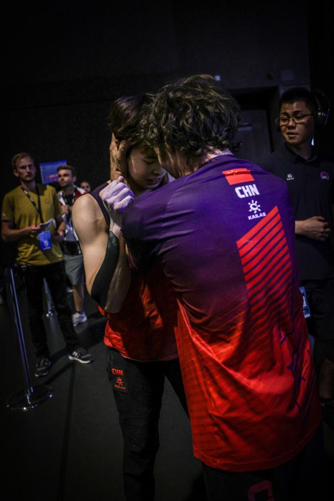 但疼痛,此刻正在潘愚非悬挂在空中的身体里蔓延——两周前双双拉伤的左右小臂、刚刚在决赛中又一次摔伤的腰部,“每一步,都要靠拼”。赛后,潘愚非回忆道,最后的攀爬前,左腿疼得已经有些抬不起来;爬到中段,“感觉眼前视野都逐渐变黑了”。