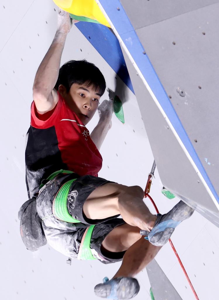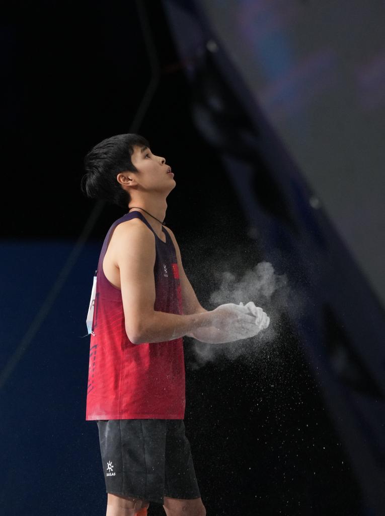 8月7日,潘愚非在巴黎奥运会攀岩项目男子两项全能半决赛中。新华社记者 高静 摄