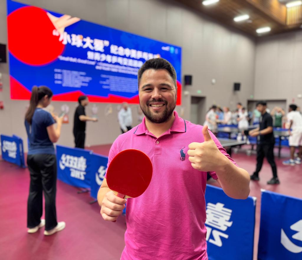 新华社上海6月18日电(记者黄安琪)“我家的地下室有个乒乓球桌,我从小就和两个弟弟以及父母在那里打球,我们全家都热爱这项运动!”美国肯恩大学心理学专业学生多米尼克·比拉尔多说,今天第一次和中国的朋友一起打乒乓球,感觉很特别。