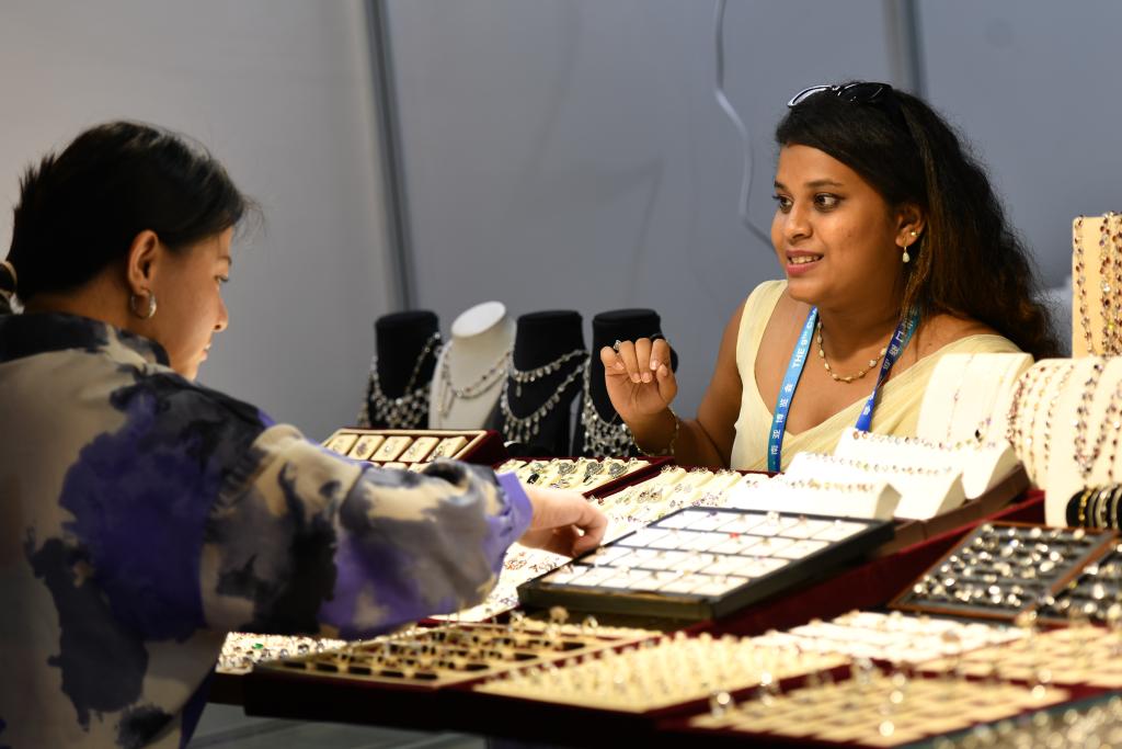 6月19日,斯里兰卡展区的展商向顾客推介特色饰品。新华社发(彭奕凯 摄)