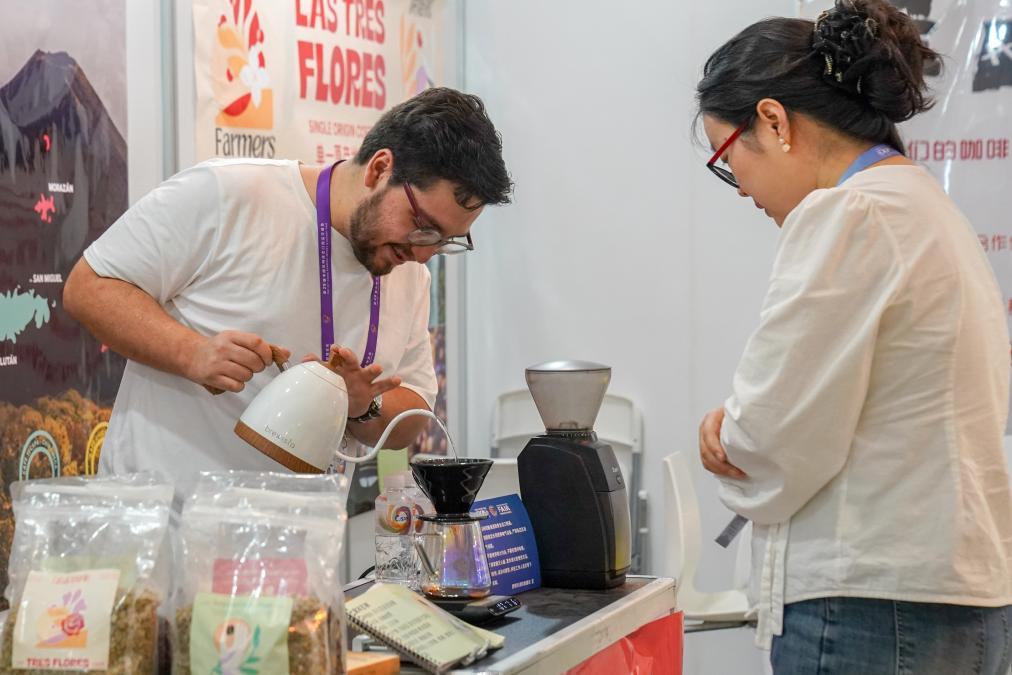 6月20日,来自萨尔瓦多的参展商(左)在咖啡产业馆为顾客冲咖啡。 新华社发(彭奕凯 摄)