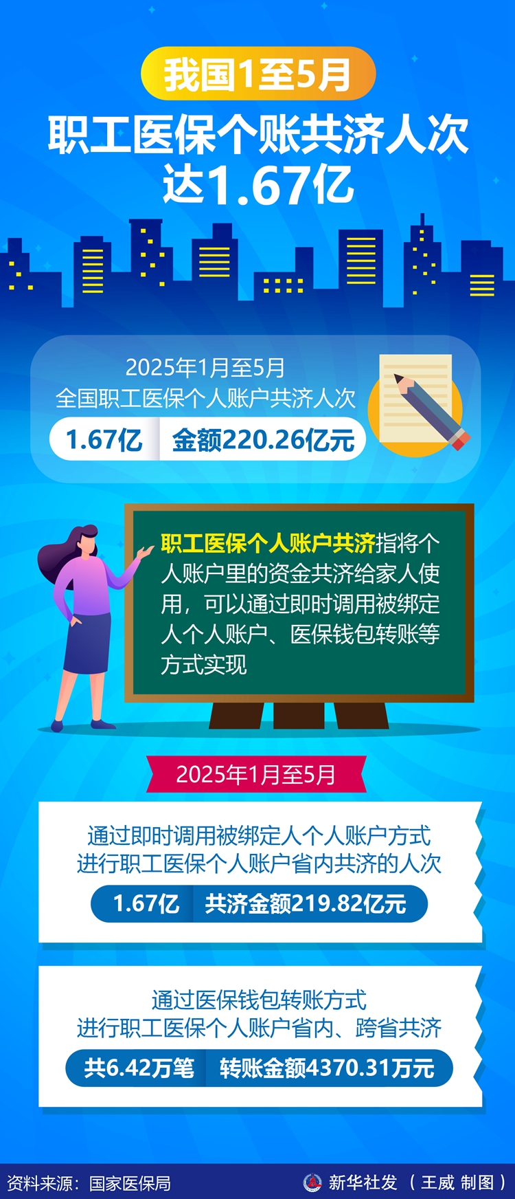 职工医保个人账户共济指将个人账户里的资金共济给家人使用,可以通过即时调用被绑定人个人账户、医保钱包转账等方式实现。今年1月至5月,通过即时调用被绑定人个人账户方式进行职工医保个人账户省内共济的人次1.67亿,共济金额219.82亿元。通过医保钱包转账方式进行职工医保个人账户省内、跨省共济共6.42万笔,转账金额4370.31万元。