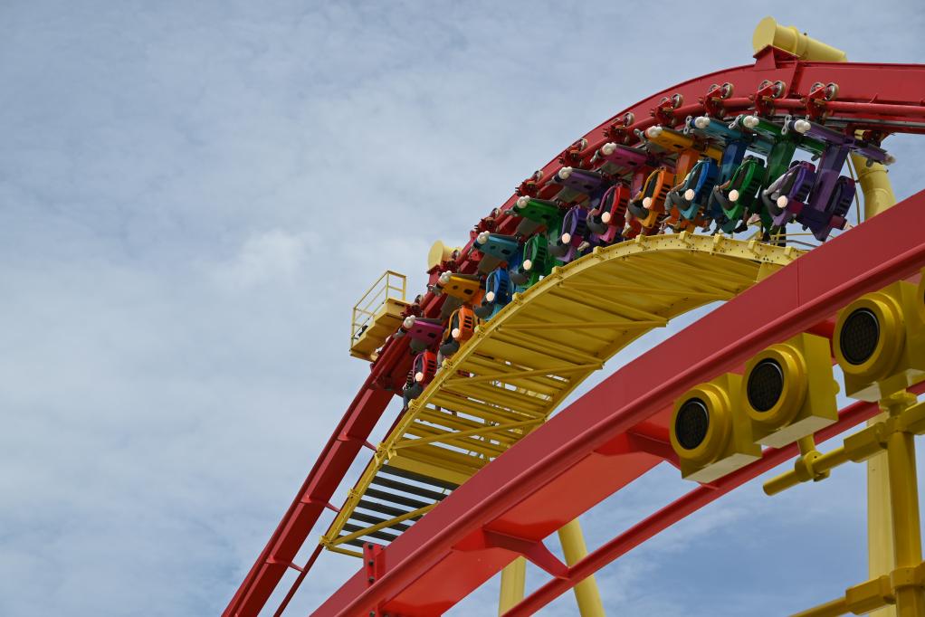 在乐园门口,人们有序通过人脸识别或刷身份证入园。相较此前的内测阶段,公众试运营期间乐园内更多骑乘设备开放,其中就包括全球首发项目“乐高大飞车”。外观有着缤纷色彩的飞车驶过巨型人仔“搭搭”,不时传来游客的欢呼尖叫,为乐园增添了一些“刺激”的气氛。
