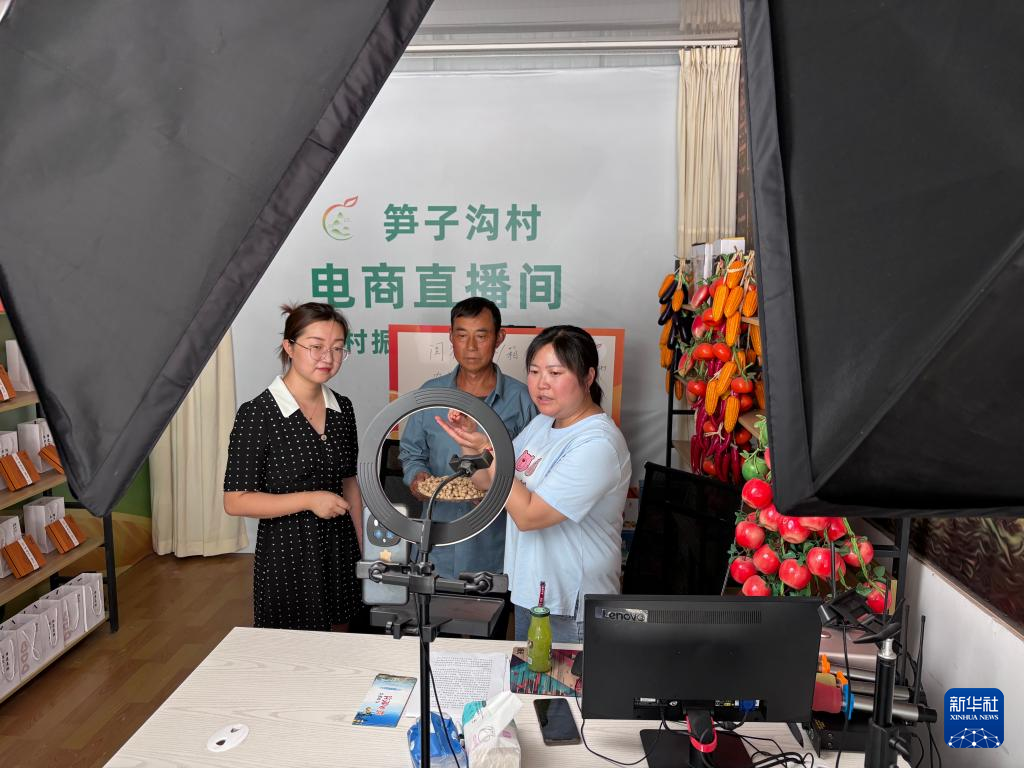 6月17日,在四川省广元市苍溪县陵江镇笋子沟村电商直播间,村支部书记张桂华(左)和村民一起直播。新华社发(王韬摄)