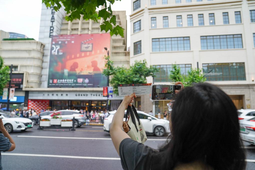 同日的南京西路,大光明电影院前,不少观众拿着票根与今年上海国际电影节的海报合影。来自杭州的小刘当天一早出发,只为赴一场与“电影之城”的约定。“今天在大光明电影院看了《天涯沦落女》和《春潮》两部电影,行前特地做了功课,看完后感觉不虚此行,我很喜欢上海这座城市和电影擦出的别样火花。”