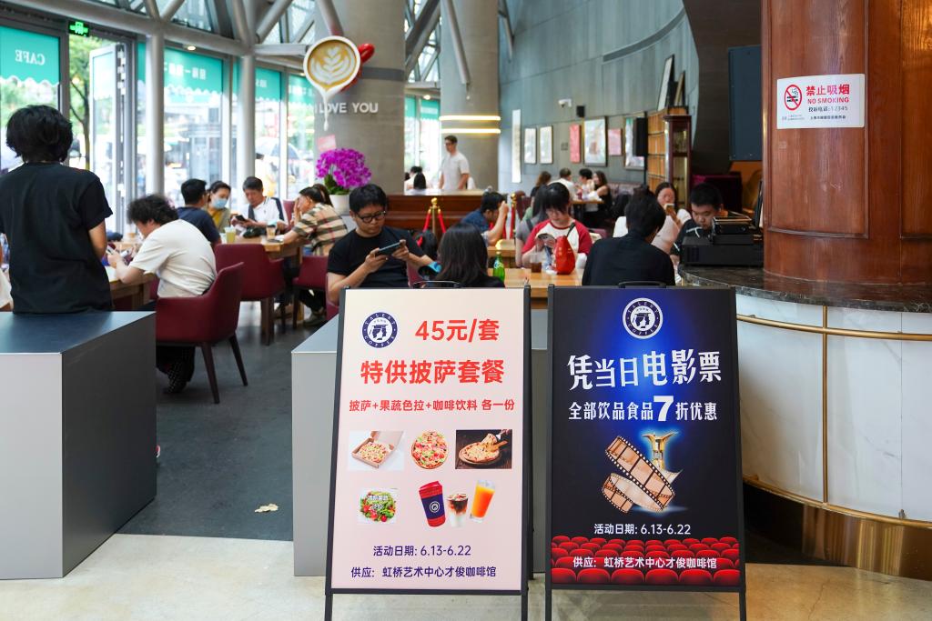 6月15日,位于虹桥艺术中心的天山电影院人头攒动。在影院客流带动下,一楼咖啡馆的顾客也是络绎不绝。“我们在电影节期间推出特供披萨套餐,凭当日电影票根可以享受全场饮品7折的优惠,饮品的销量也比平时大幅增加。”餐厅服务员介绍。