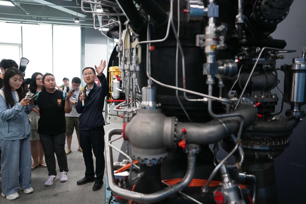 跟随采访团来到位于北京“火箭街区”的蓝箭航天,从展厅内我国首款成功入轨的液氧甲烷运载火箭的回收残骸,到大厅中央1:1复刻的九台发动机并联的朱雀三号尾部模型,无不让记者深切感受到民营火箭企业加速奔跑的蓬勃活力。