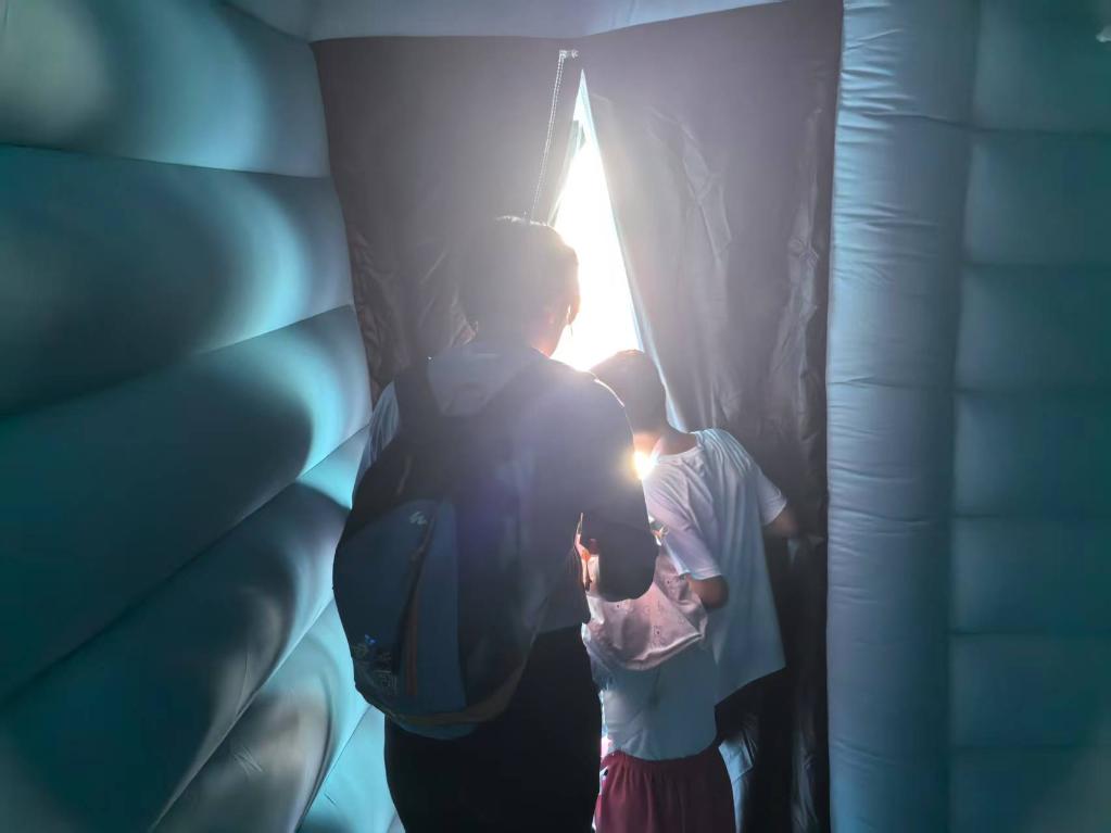 这是约60平方米的充气式体验舱中的对话。大家有序排队,分组走进一片漆黑世界。