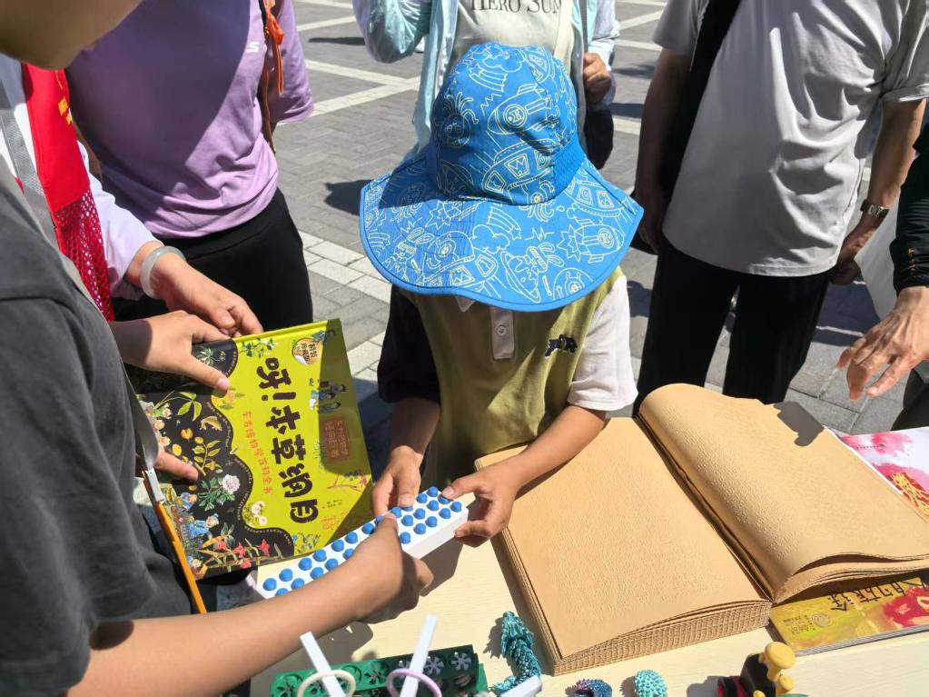 6月22日,一位小朋友在北京紫竹院公园认识盲文书、盲文学习器。新华社记者 魏冠宇 摄