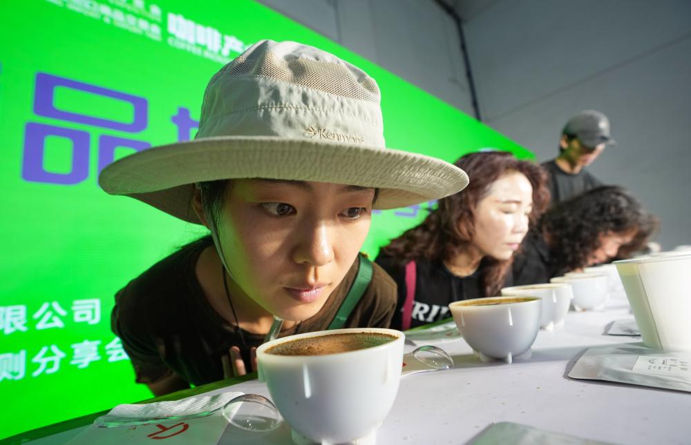 6月20日,一名观众在第9届中国—南亚博览会咖啡产业馆体验咖啡杯测。新华社记者陈欣波 摄