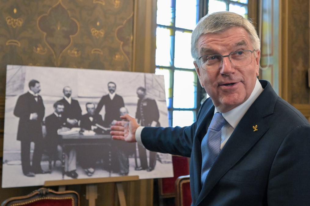 ↑2024年7月19日,巴赫指向首届国际奥委会成员的照片。当日,巴赫到访巴黎索邦大学。1892年,“现代奥林匹克之父”顾拜旦在此发表演讲,首次公开提出恢复奥运会。1894年6月23日,国际奥委会在此正式成立。新华社发