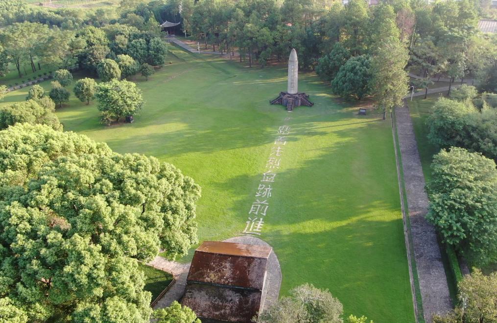 2024年9月,江西省瑞金市叶坪红军广场,瑞金红军烈士纪念塔巍然耸立,地面上有“踏着先烈血迹前进”八个遒劲大字(无人机照片)。新华社记者 余刚 摄