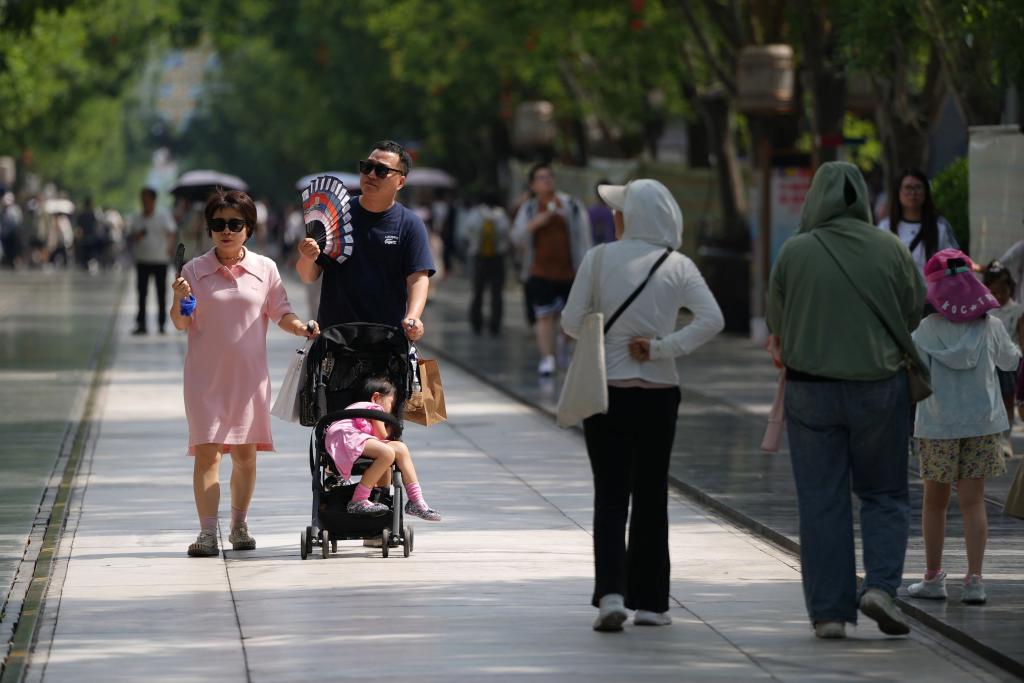 6月23日,在北京前门大街,游客在高温下参观游览。新华社记者鞠焕宗摄