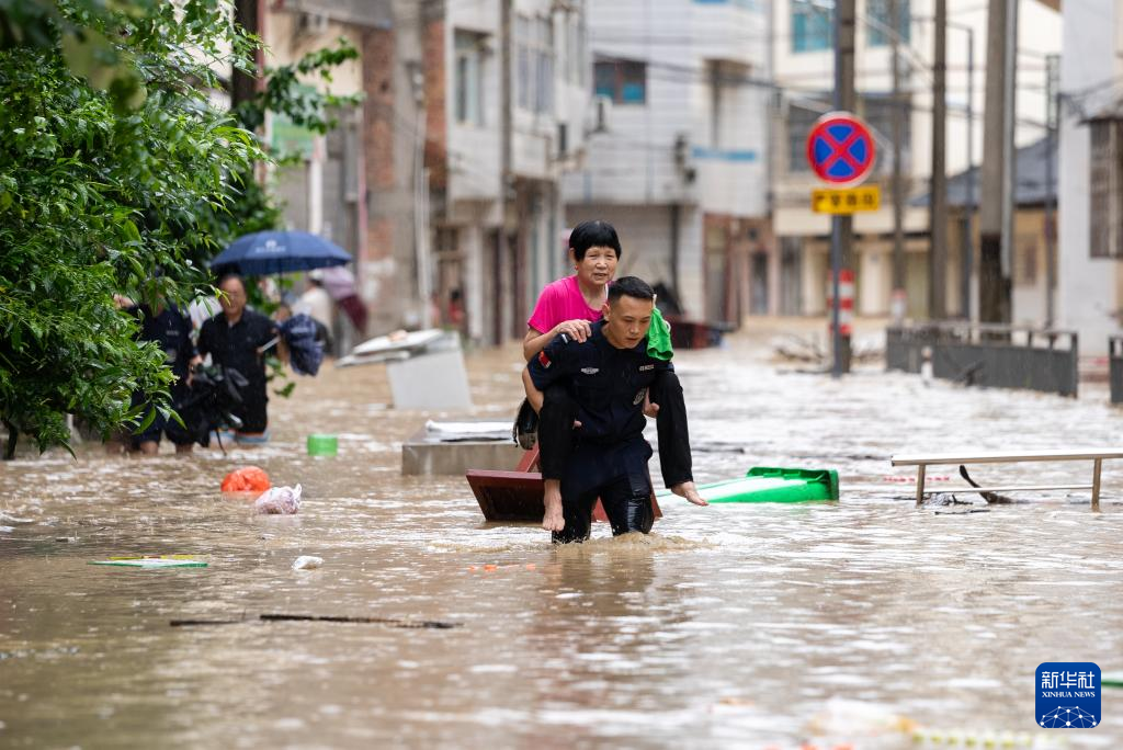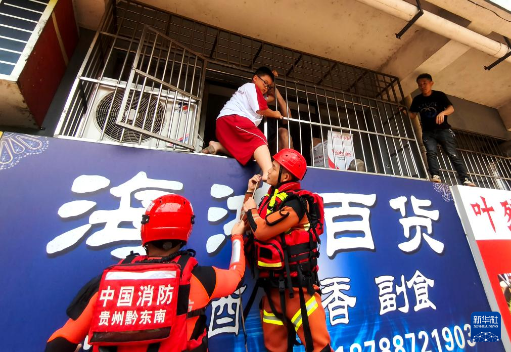 6月24日,在贵州省黔东南州从江县,救援人员将受灾群众转移至安全地带。新华社发(卢忠南摄)
