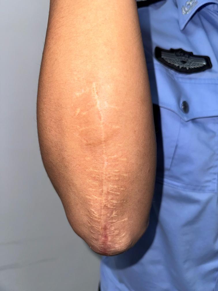 俊豪右肘植入钢钉处的疤痕。新华社发