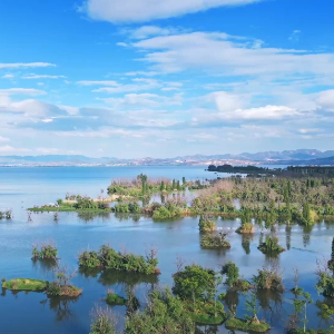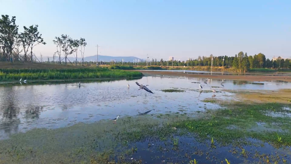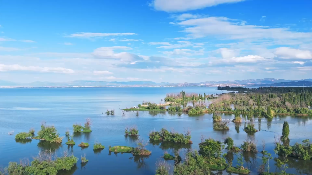 仲夏时节,云南省昆明市晋宁区滇池湖光潋滟,沿岸绿意正浓,南滇池、古城、甸心等湿地水草丰茂、水鸟翔集,湿地与村庄相映成趣,共绘一幅人与自然和谐共生的夏日画卷。