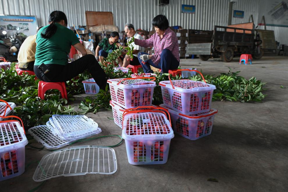 6月18日,在广东茂名高州市,果农正在打包荔枝。新华社记者 肖恩楠 摄