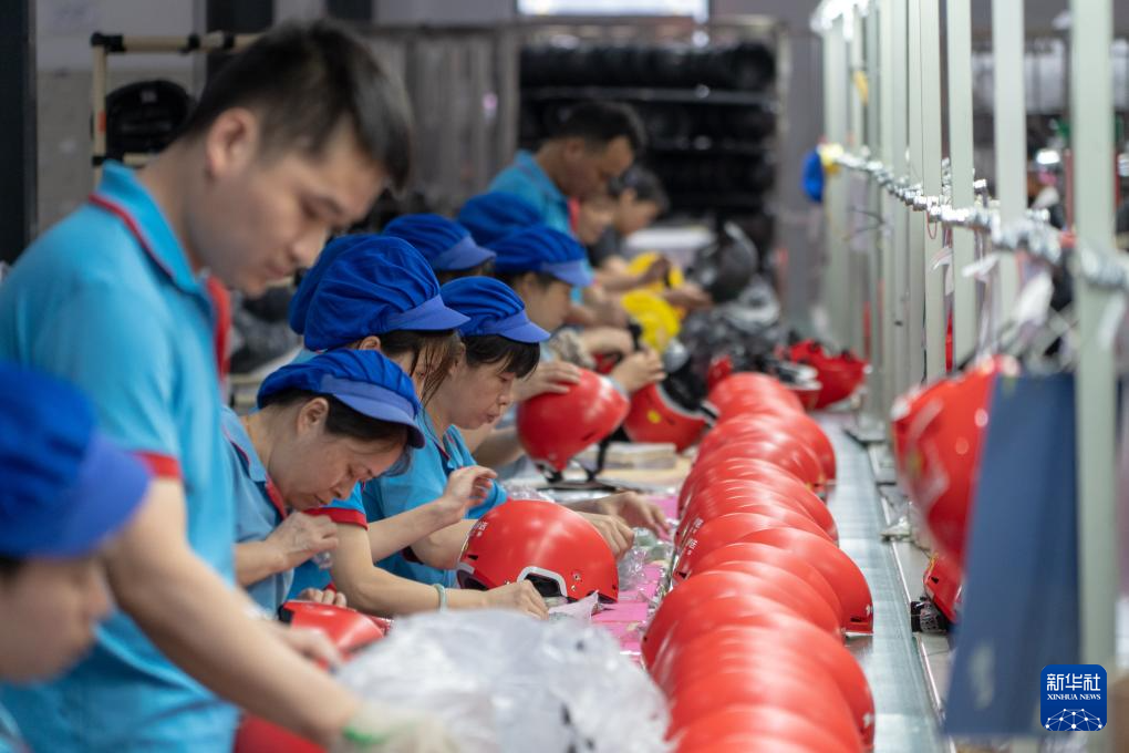 工人在溢联科技有限公司生产车间生产电动车头盔(6月17日摄)。 新华社记者 郭杰文 摄
