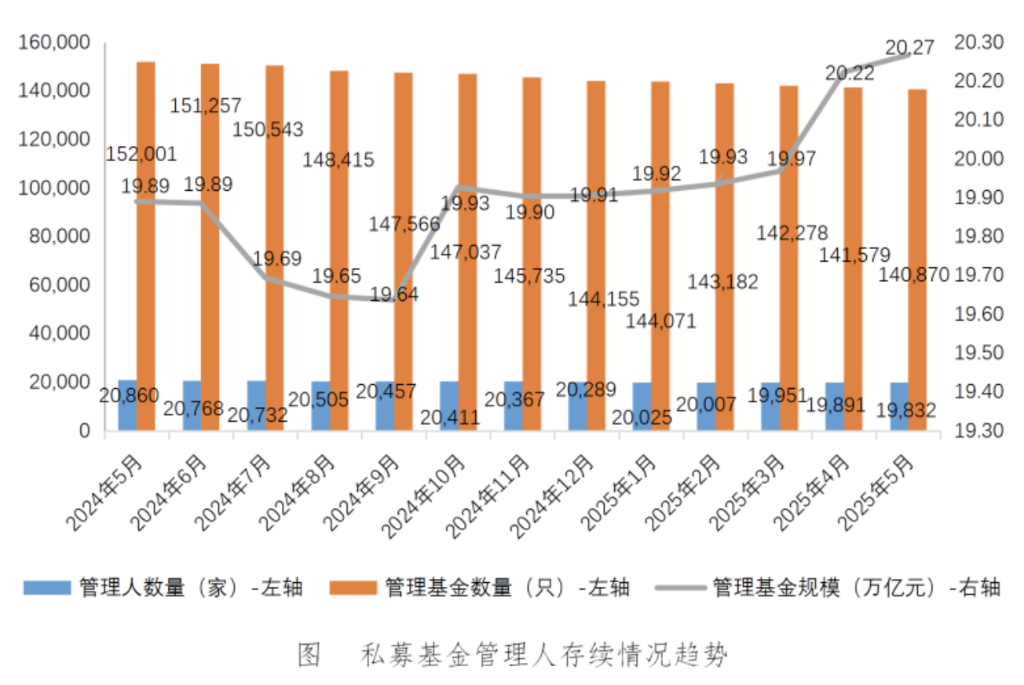截至2025年5月末,存续私募基金140870只,存续基金规模20.27万亿元。其中,存续私募证券投资基金83829只,存续规模5.54万亿元;存续私募股权投资基金30201只,存续规模10.98万亿元;存续创业投资基金25973只,存续规模3.41万亿元。(记者刘羽佳)