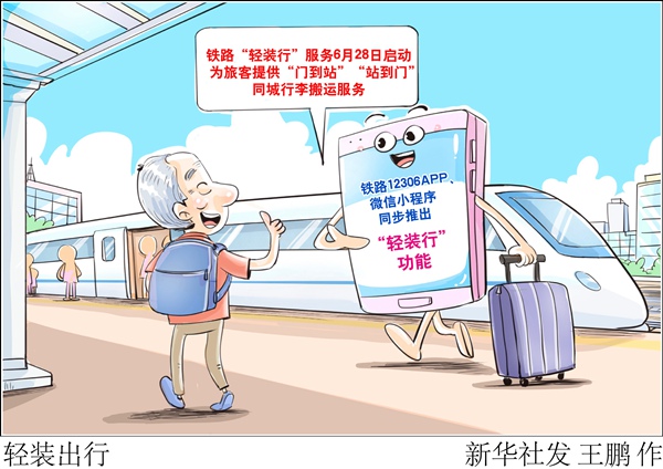 新华社北京6月28日电(记者樊曦)记者从中铁快运股份有限公司获悉,28日起,铁路部门在北京西、上海虹桥、广州南等19座车站试点开展“轻装行”服务,为旅客提供“门到站”“站到门”同城行李搬运服务,铁路12306APP、微信小程序同步推出“轻装行”功能,旅客可通过线上预约办理,将有效减轻携带大件行李出行的负担,乘坐火车出行更加方便快捷。
