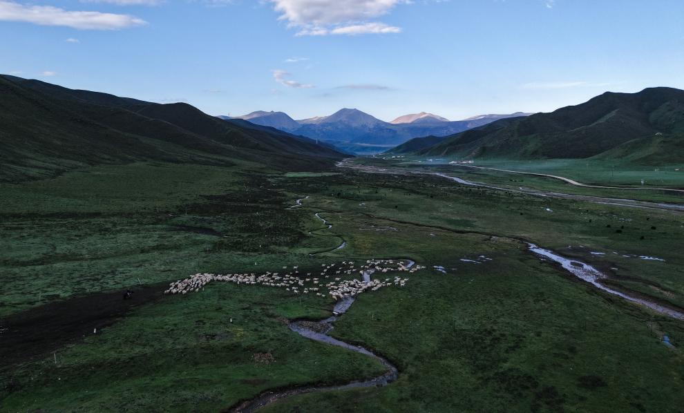6月25日清晨,万卓与先巴尖措赶着牛羊在转场路上(无人机照片)。新华社记者 张龙 摄