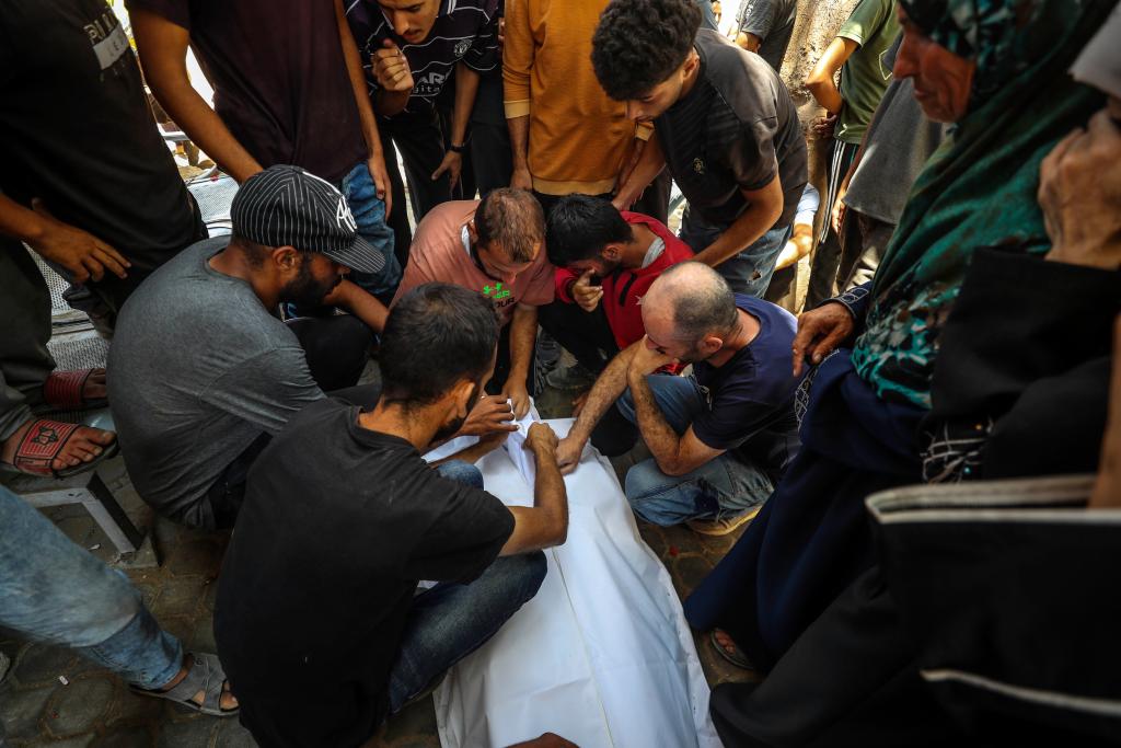 6月25日,巴勒斯坦人在加沙城一所医院悼念以军袭击中的遇难者。新华社发(马哈茂德·扎基摄)