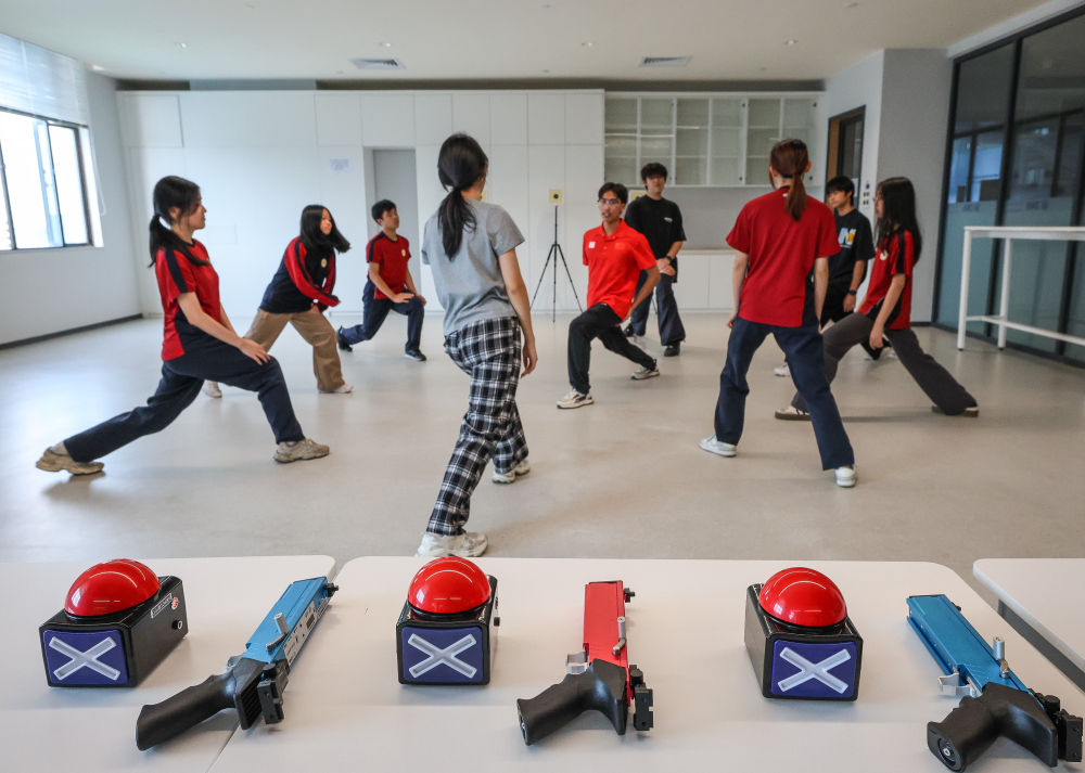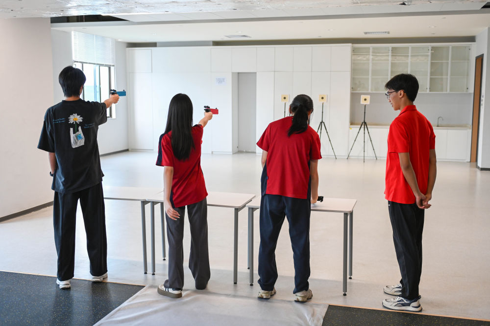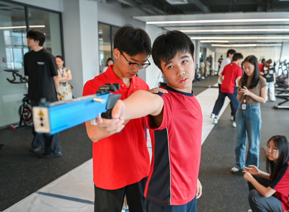 ↑图为学生们在广州市中黄港澳子弟学校运动室进行射击训练(6月19日摄)。新华社记者 肖恩楠 摄