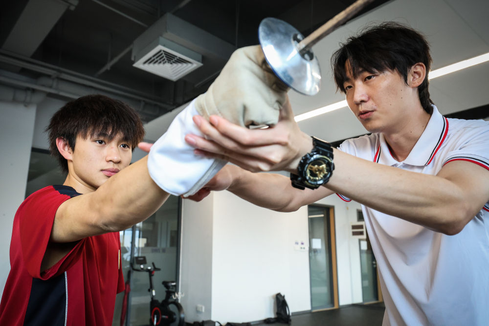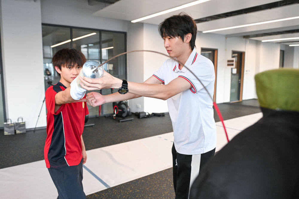 ↑图为广东现代五项运动协会教练员肖勇炫(右)纠正广州市中黄港澳子弟学校港籍生张嗣涛击剑技术细节(6月19日摄)。新华社记者刘大伟摄