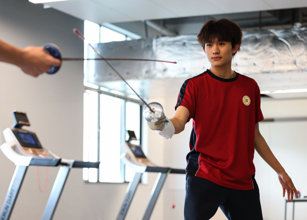 ↑图为广州市中黄港澳子弟学校港籍学生张嗣涛进行击剑训练(6月19日摄)。新华社记者刘大伟摄