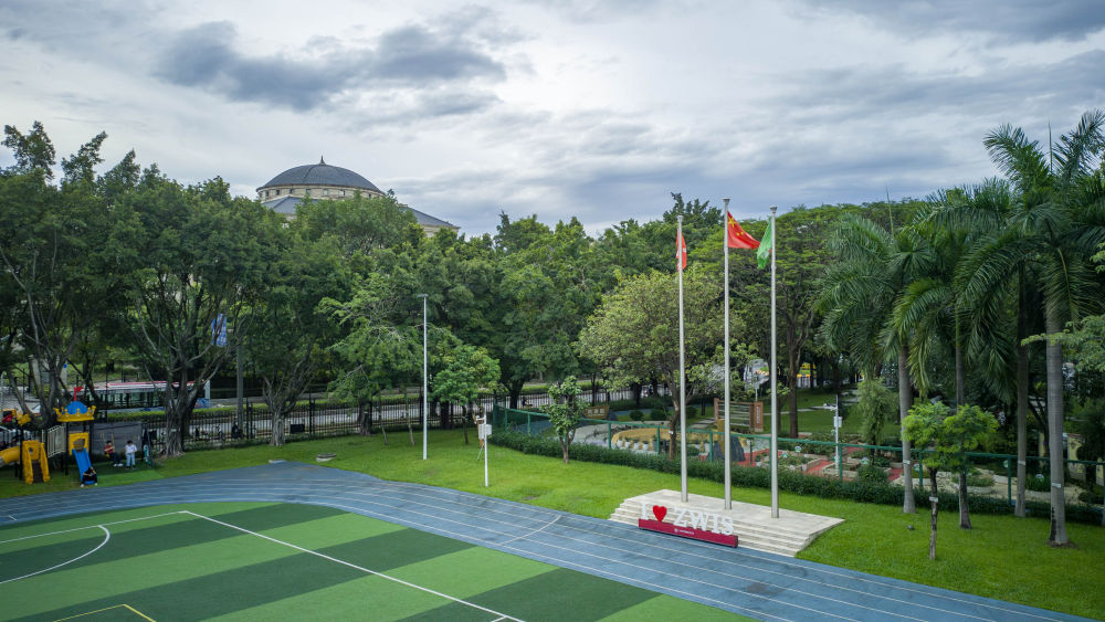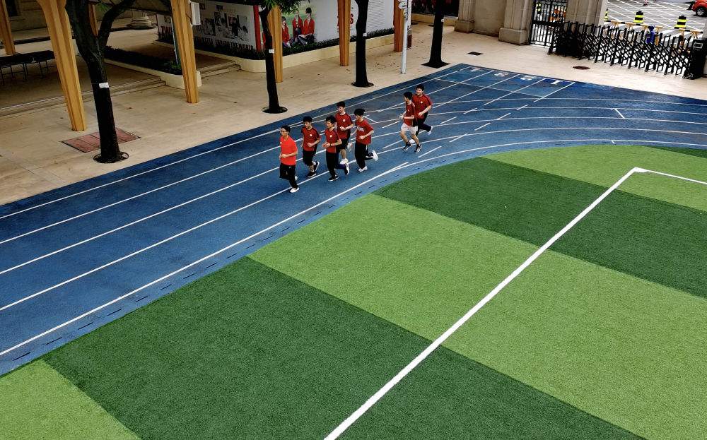 ↑图为6月19日拍摄的广州市中黄港澳子弟学校操场(无人机照片)。新华社记者肖恩楠摄