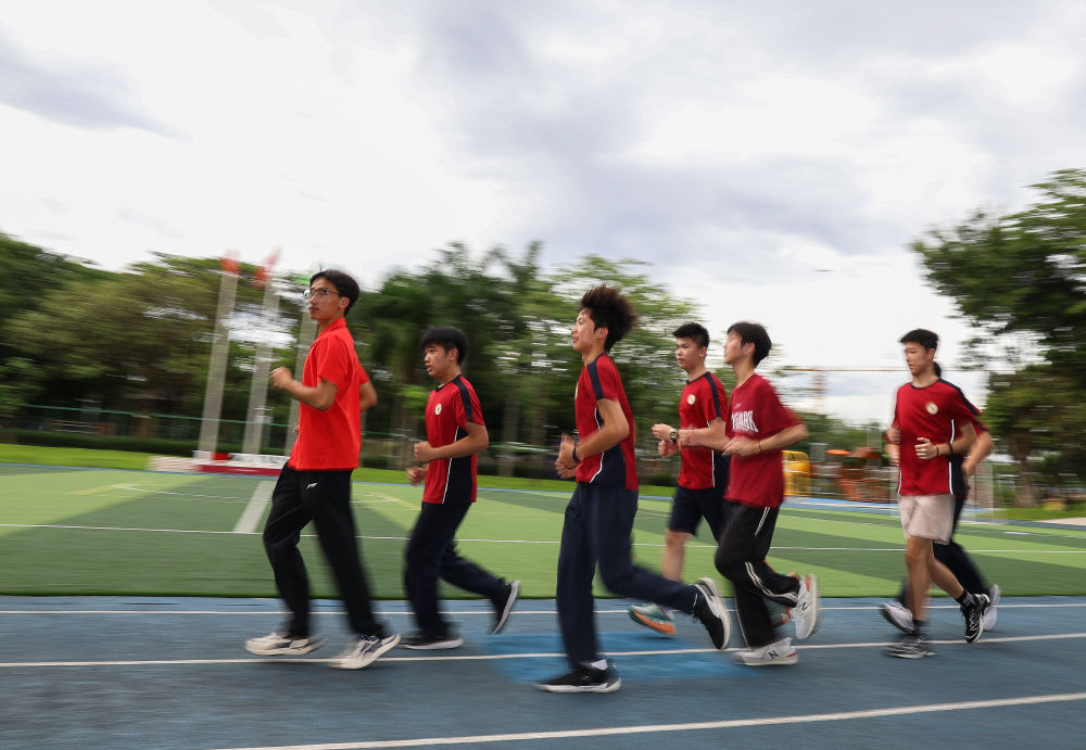 ↑图为广东现代五项运动协会教练员滕泽华(左一)带领广州市中黄港澳子弟学校学生进行慢跑训练(6月19日摄)。新华社记者肖恩楠摄