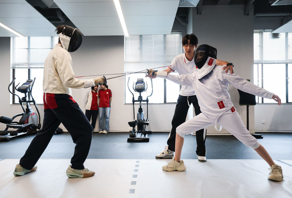 ↑图为广东现代五项运动协会教练员肖勇炫(右二)纠正广州市中黄港澳子弟学校港籍生尹泽语的击剑技术动作(6月19日摄)。新华社记者刘大伟摄