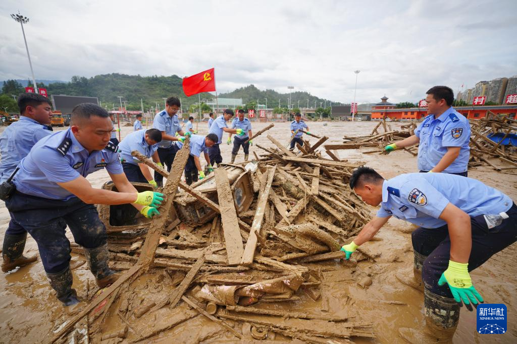 6月29日,在贵州省榕江县“村超”球场,来自丹寨县公安局的党员民警潘建航(左二)和同事一起清理因洪灾受损的球场设施。新华社发(杨武魁摄)