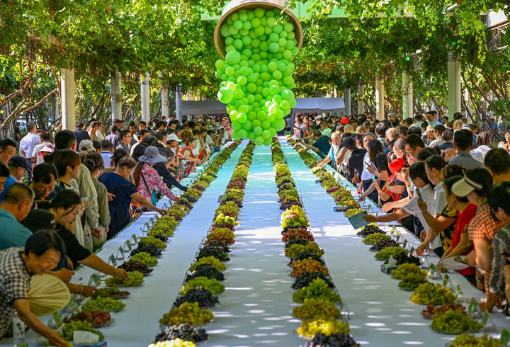 人们在新疆吐鲁番特色葡萄集市上品尝葡萄(2024年8月17日摄)。新华社记者 陈朔 摄