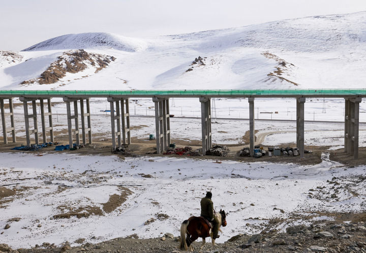 2024年12月30日,在新疆和静县,牧民骑马从在建的新疆乌尉(乌鲁木齐至尉犁)高速公路附近经过。新华社记者 王菲 摄