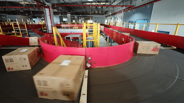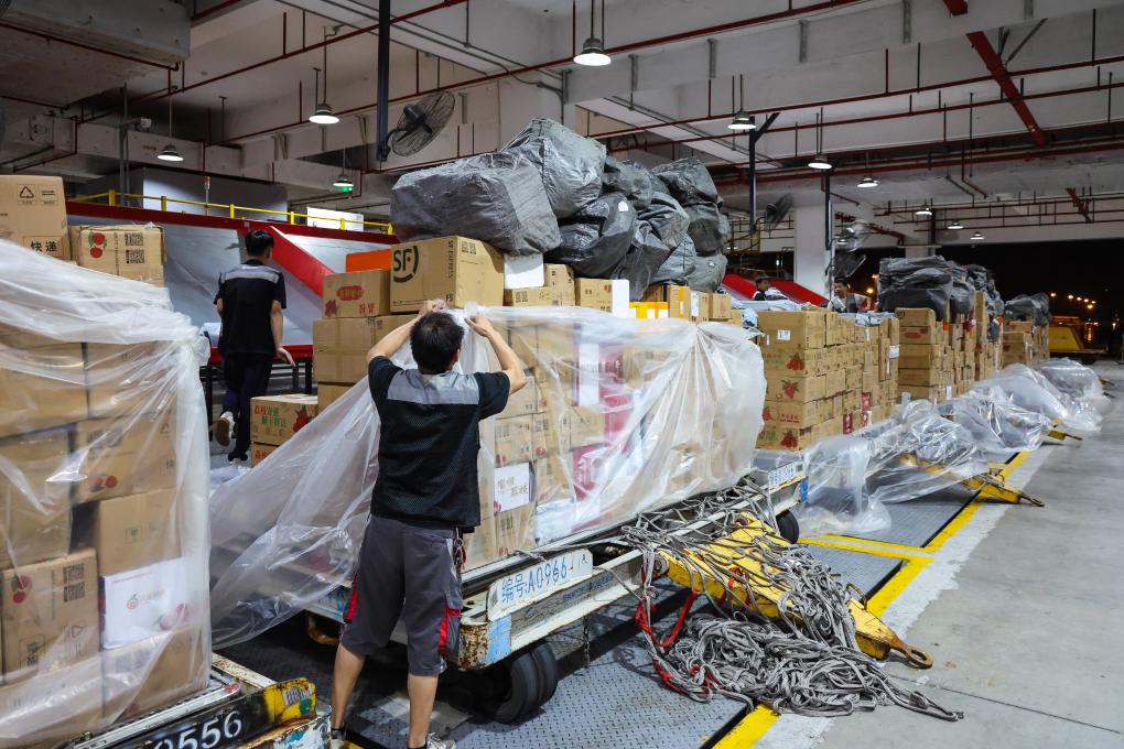 经过专用卸货口卸货、自动化矩阵分拣、组装货机整板等一系列专业操作,