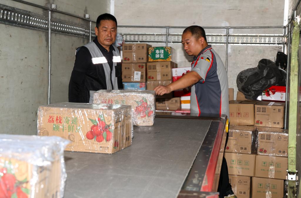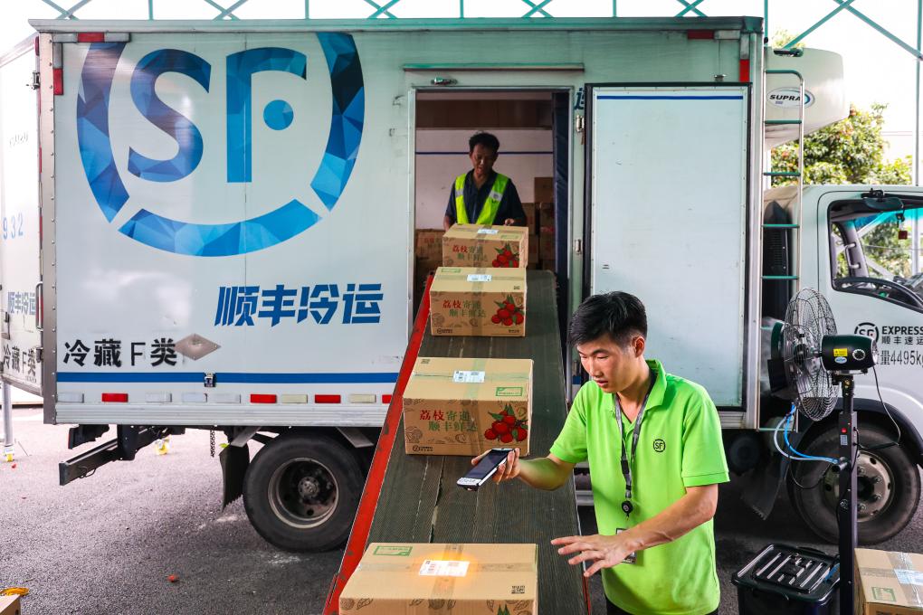 6月28日,在广州市从化区钱岗村物流服务网点,工作人员将打包好的荔枝快件送上冷藏车,准备运往广州白云国际机场航空运转枢纽。