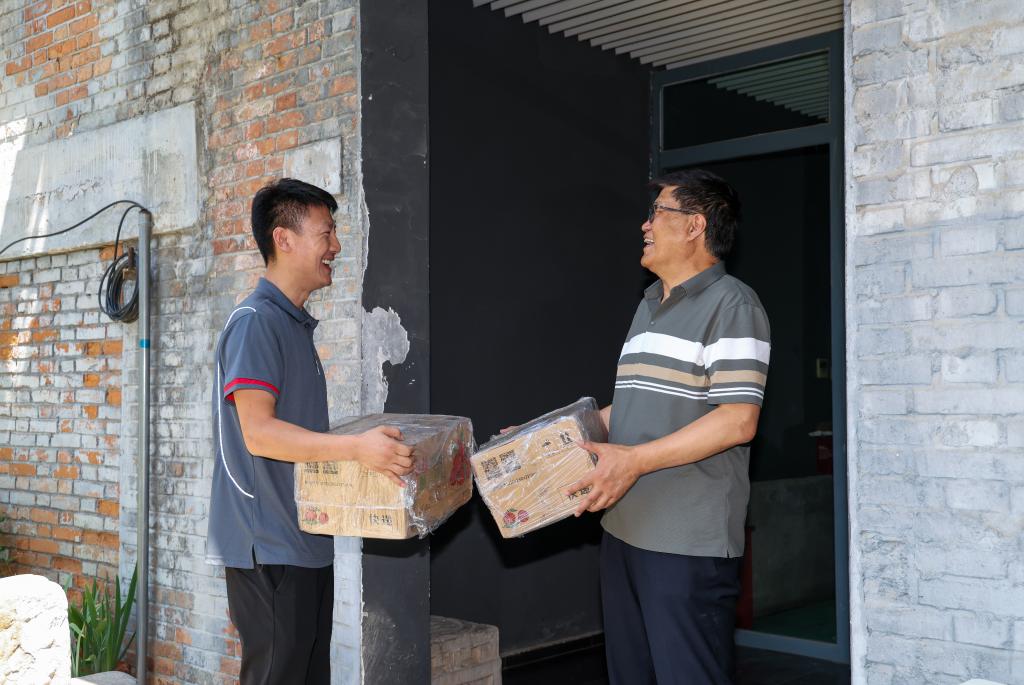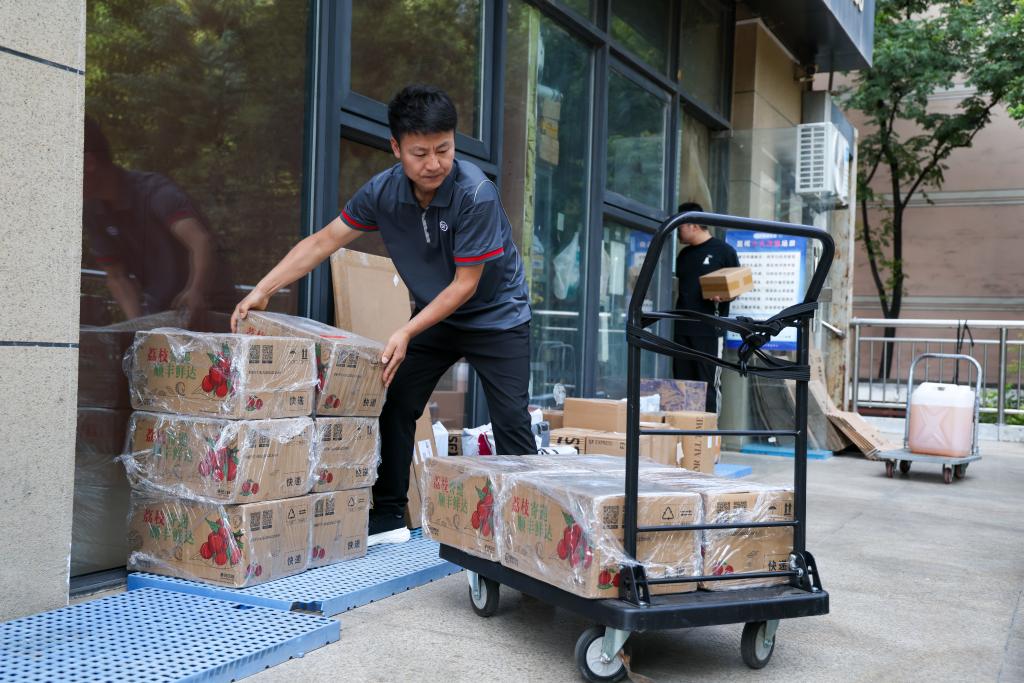 6月29日,在西安建筑科技大学,快递员李佳给顾客木先生派送荔枝。