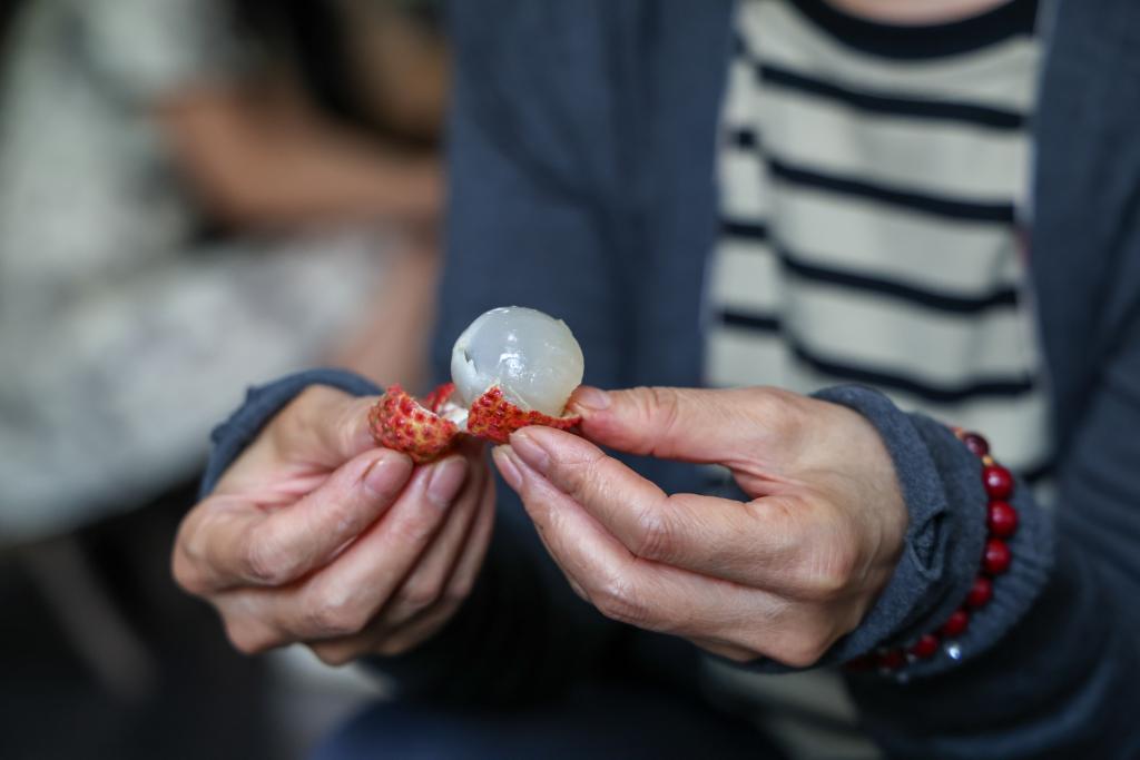 6月29日,在西安建筑科技大学,一位市民准备品尝来自广州的荔枝。